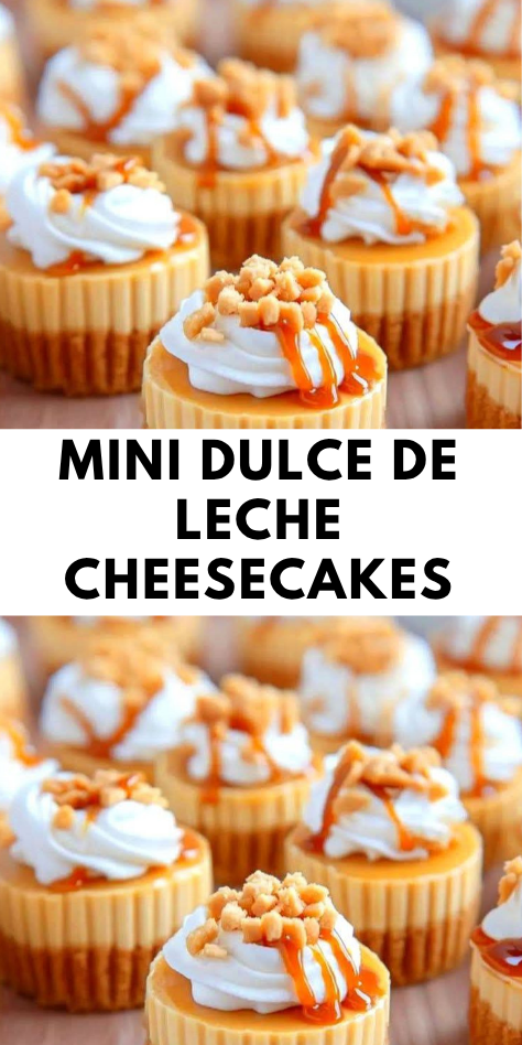 Before serving, top each mini cheesecake with a dollop of whipped cream. Sprinkle chopped nuts for crunch and texture. Finish with a generous drizzle of warm dulce de leche or caramel sauce.